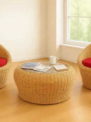 INDIACRAFT Double seating pure rattan cane couch with a large size centre table Fabric 2 + 1 Sofa Set (Biege, Pre-assembled)